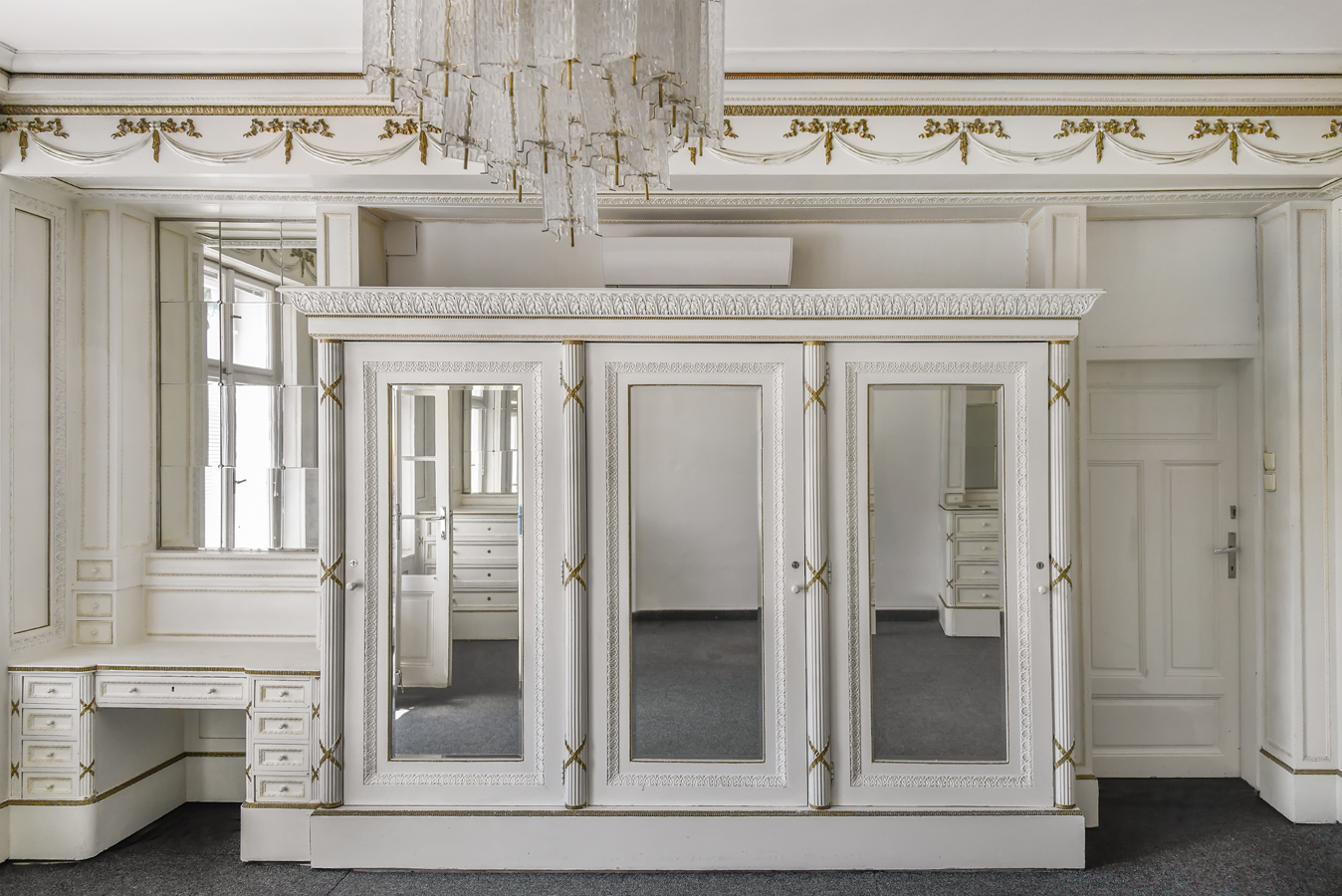 Of the historic buildings, a complex of halls, a small railway station building, and the chateau have been preserved. The chateau stands at the centre of what remains of its original park. Between 1922 and 1925, it underwent significant renovations: its facade, windows, roof, gutters, plumbing, drains, and central heating were updated, and old parquet floors were restored. During this period, the Bauers sold the surrounding land for the construction of the modern exhibition grounds in 1928.