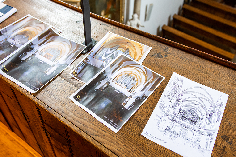 Like many other churches in Brno, the Church of the Holy Trinity and its monastery were severely damaged multiple times over the centuries, especially during wars. Despite this, the church still houses a three-manual pneumatic organ located in the choir loft. The current organ was constructed in 1950, a challenging time when limited resources led to the use of substandard materials. Some register ranks were salvaged from older organs, while others were omitted entirely due to material shortages. After forty years of use, the entire console had to be replaced.